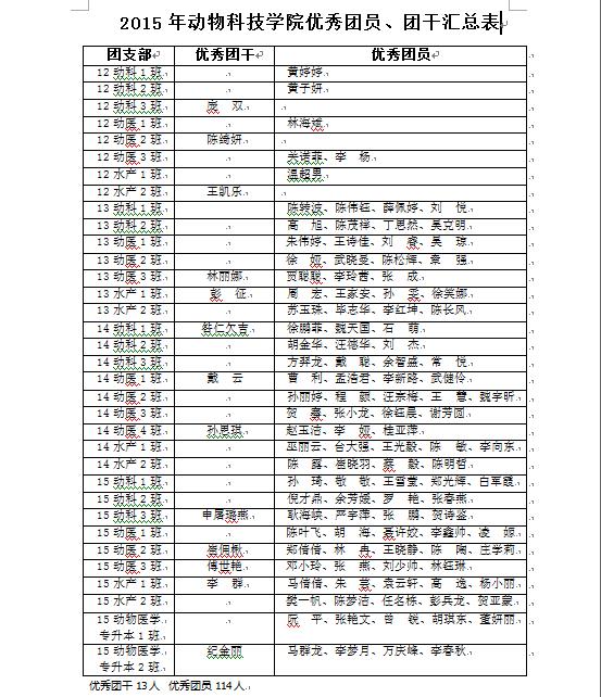 动物科技学院2014-2015学年优秀团员、优秀团干、先进团支部评选结果公示
