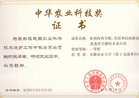 近日,从农业部获悉,由中国农业科学院北京畜牧兽医研究所主持、我校动物科技学院家禽遗传育种与生产创新团队等单位共同完成的“黄羽肉鸡节粮、优质和抗病新品系选育关键技术及应用”成果获2015年度“中华农业科技奖”一等奖。